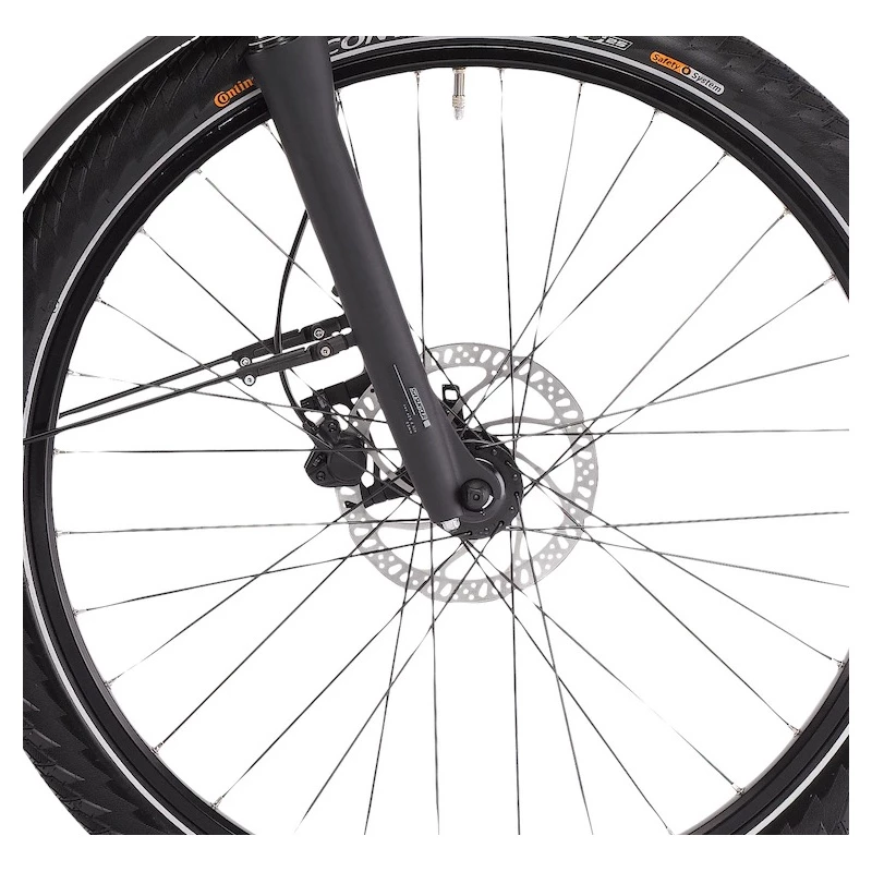 De robustes pneus SChwalbe renforcés de 27,5 » et une fourche aluminium à suspension à l’avant vous permettront d’atteindre votre destination sereinement, même hors des sentiers battus.